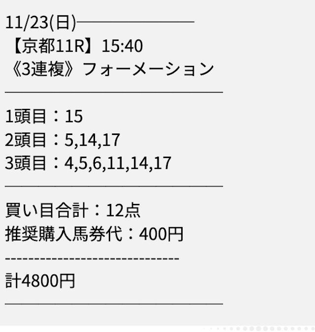 - トリガミはNG。的中と配当のバランスを重視しつつ1発も狙える網羅性のある買い目になっています。配当思考人気順だが、荒れればワンチャンあり。トリガミが心配ですが、1,2番人気が圧倒的なので配当はおいしい。