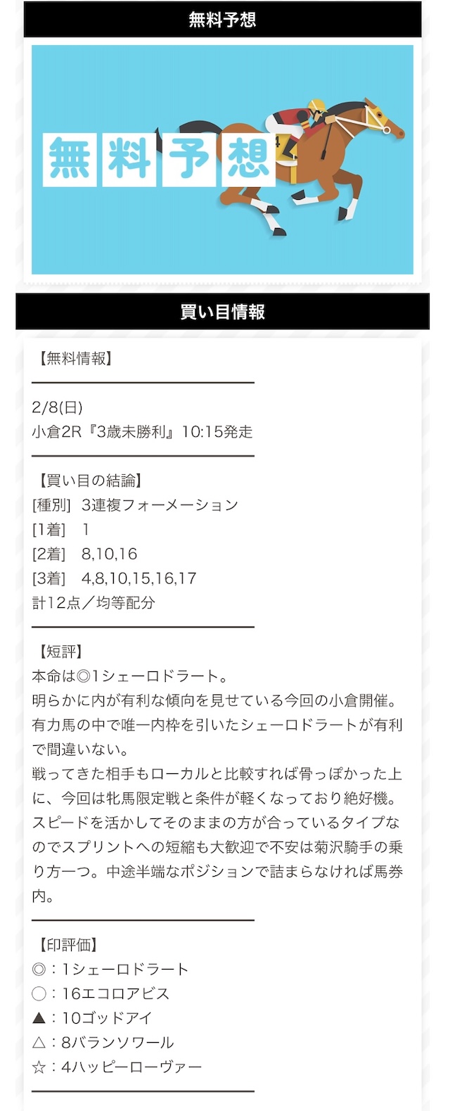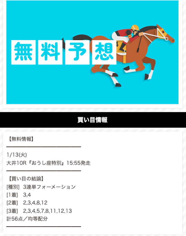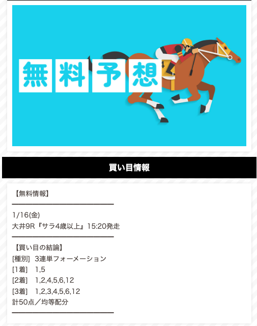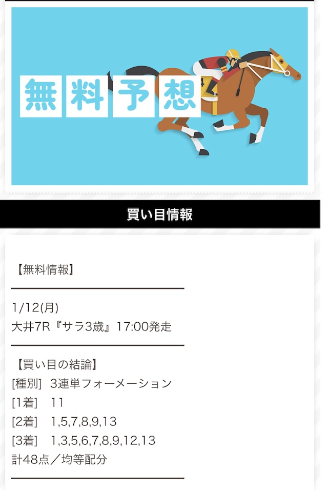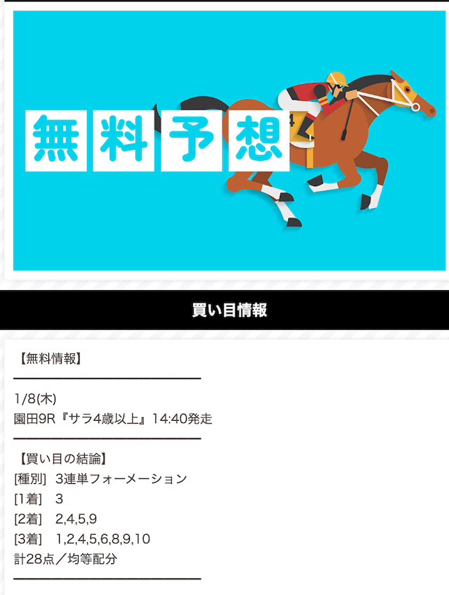 無料予想は穴狙いの予想がよく当たるという口コミ・評判が多い