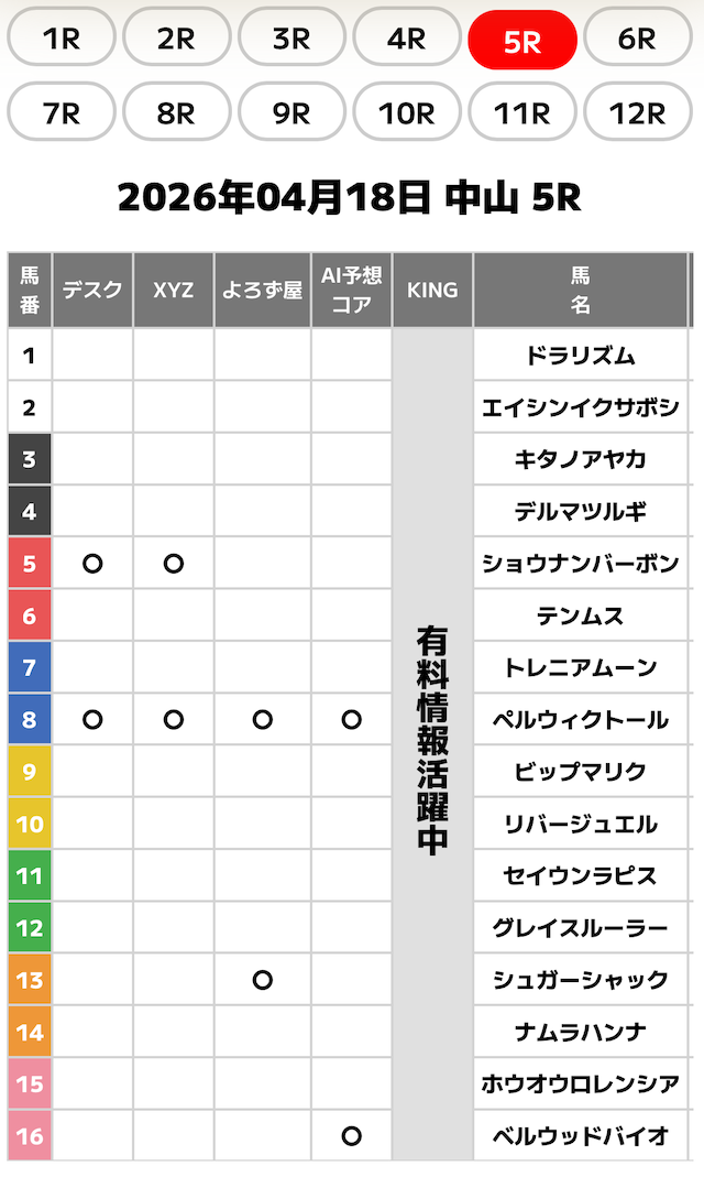 無料予想では、予想家毎に項目が分けられており、予想スタイル別の予想印を閲覧することが可能です。