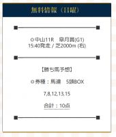 | 2022/07/23 (小倉11R) | 14,000円獲得 買い目 |