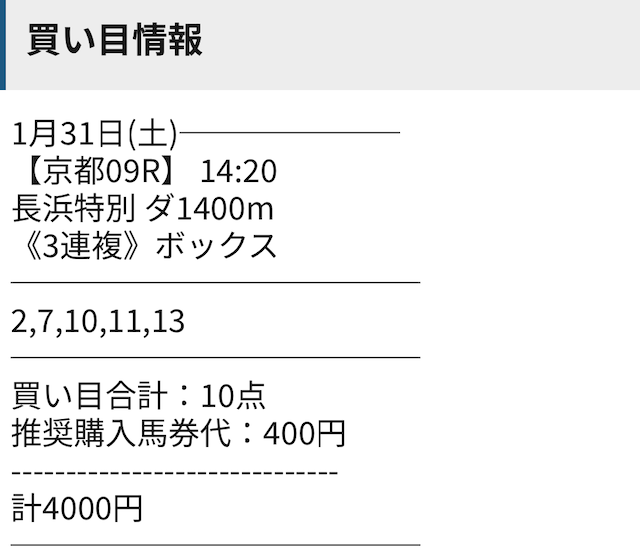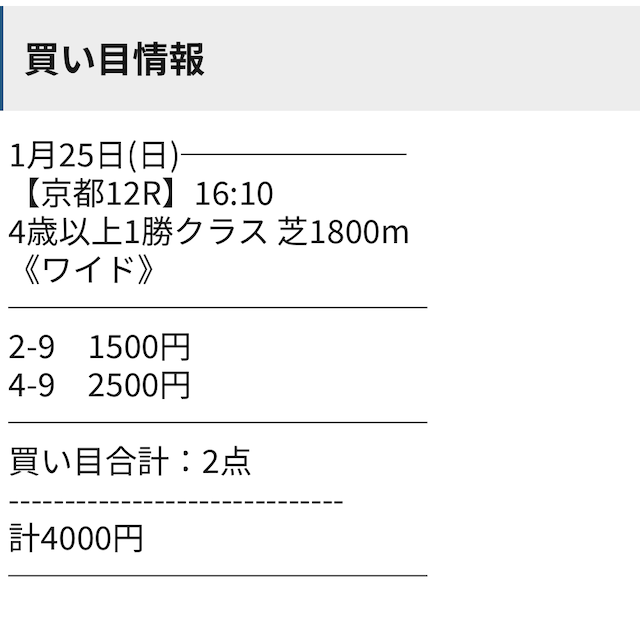 無料予想はワイドという戦略が見事にハマり、爆発力のある回収率を達成。 軍資金集めにも最適で、初心者にも優しい予想になっています。 点数も少ないので、無理のない勝負ができるのが魅力的です。 券種を変えてもいいですが、変えるのであればボックス買いをおすすめします。 馬連・馬単で検証しましたが不的中になったので、ワイドで選ばれている馬をボックスで買えばいいだけなので、簡単な作業です。