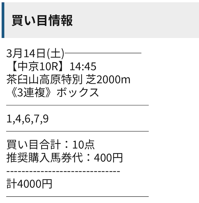 買い目に分けて投資金額が変えられてるので、条件を全て合わせ、10レース分のデータを取ってみました。