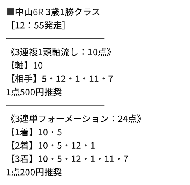| 03.21 中山6R | 軸 | 10 | スペルーチェ | 1.7倍 | 1人気 | 1着 | ✅ |