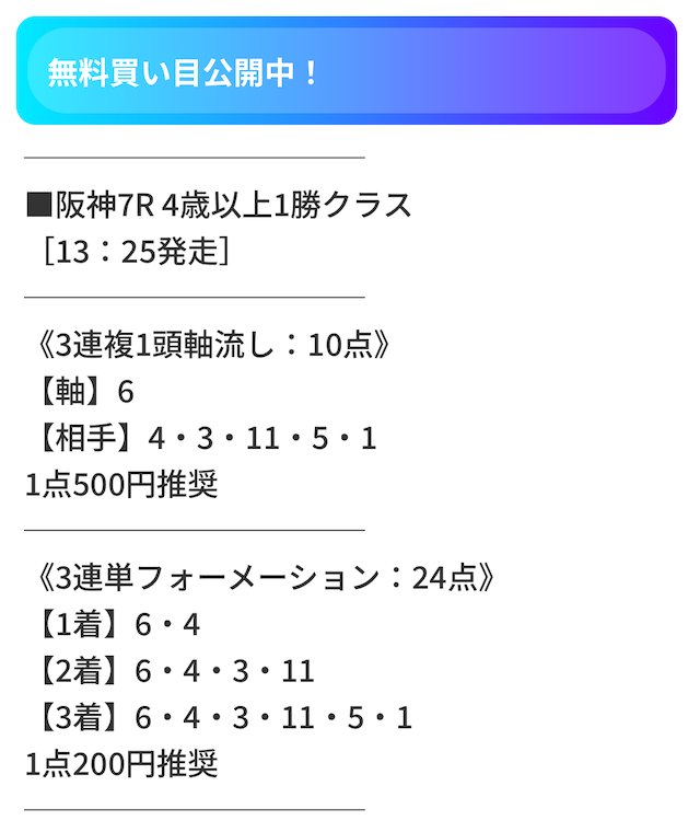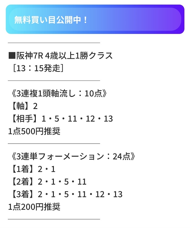 - 勝負方法:公開された買い目通りに馬券を購入