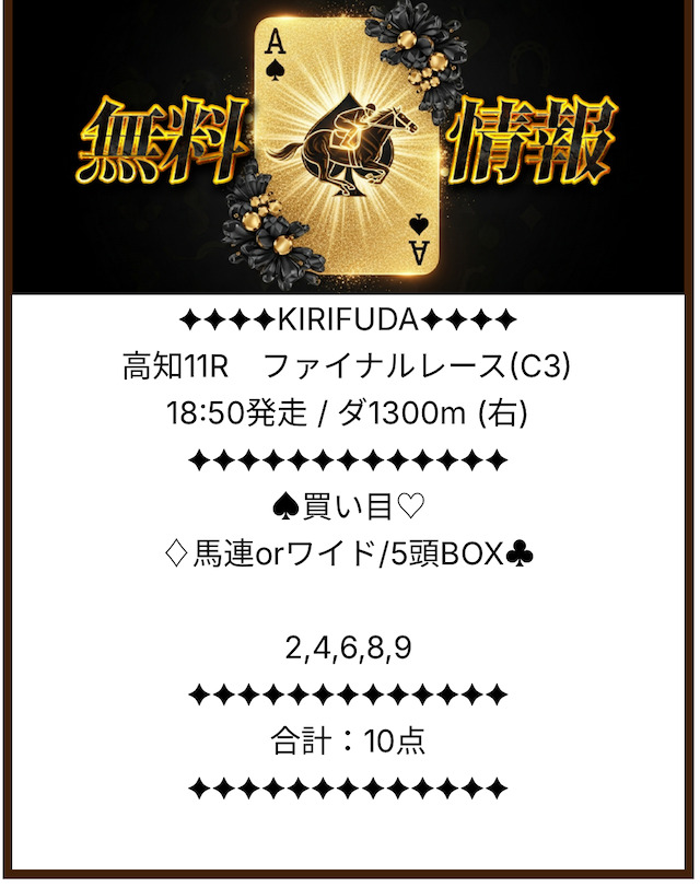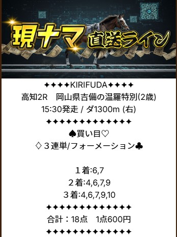 地方競馬の中でも特に「荒れやすい」と言われている高知競馬のレースを絶妙な予想で見事に的中させました。