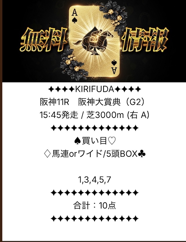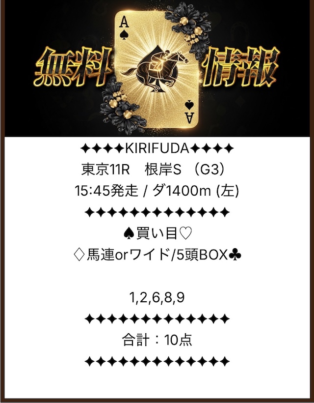 買い目においては5頭BOXという形での提供となっており、馬連もしくはワイド推奨となっています。