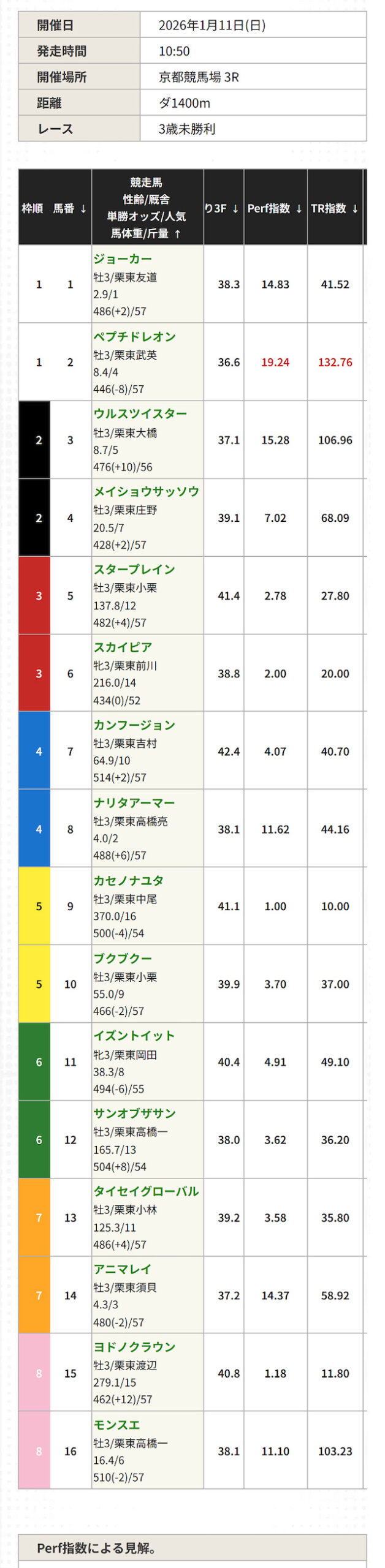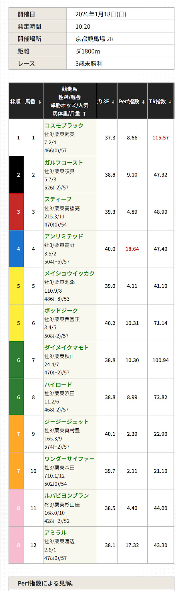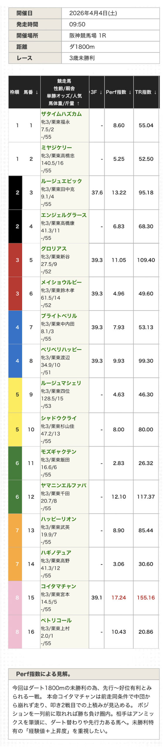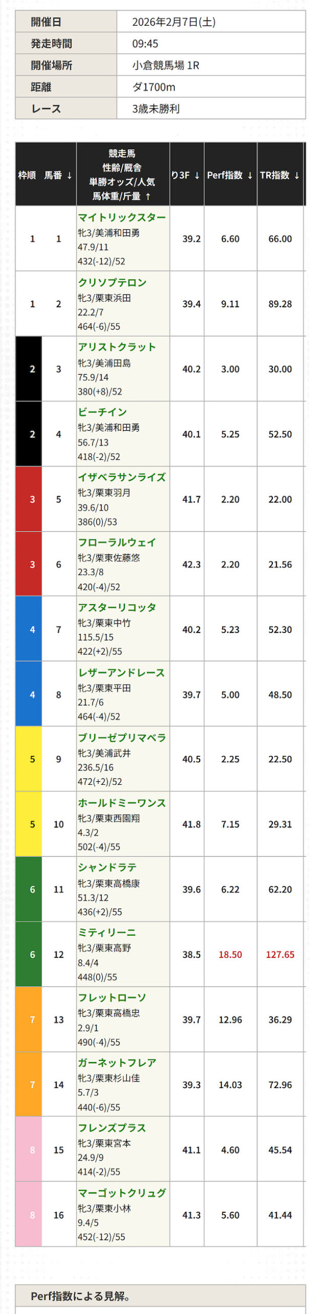 - Perf指数:着順などの実走データを多角的に評価し算出した指数