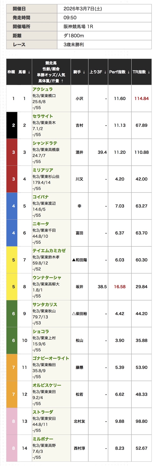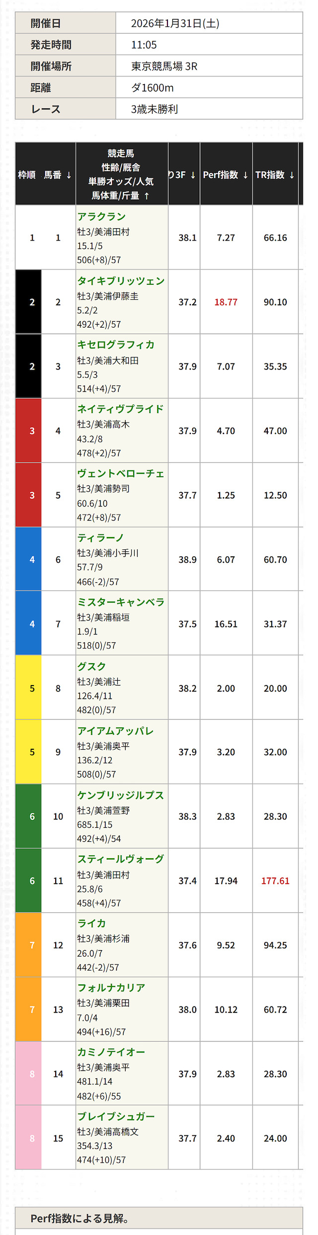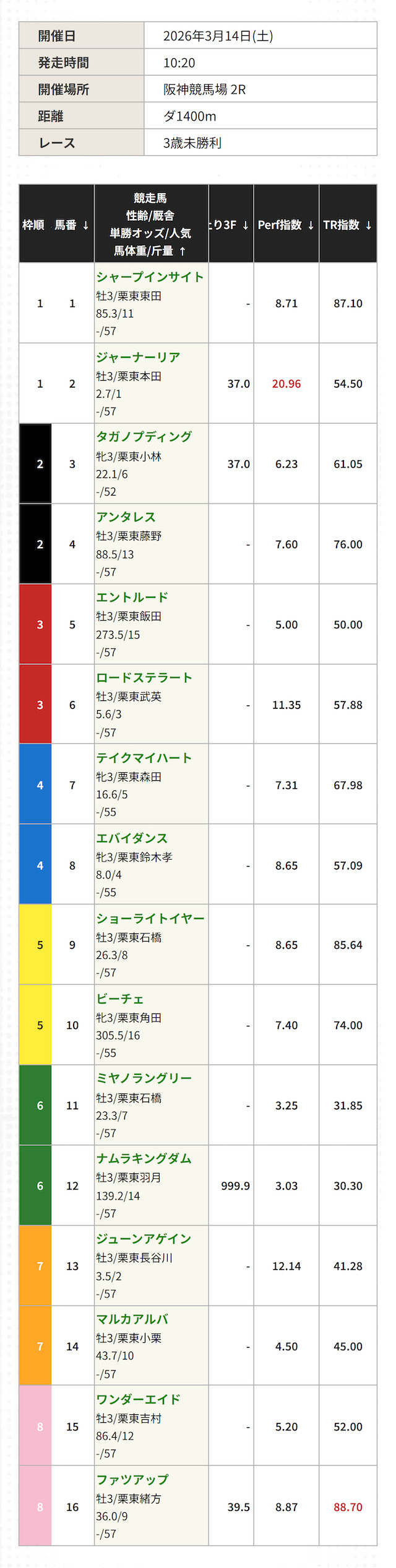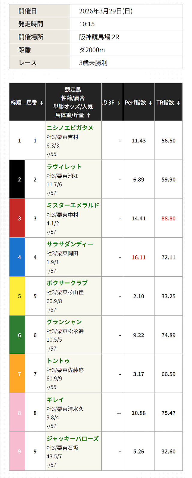 - TR指数:コース適性や枠順など各要素との相性を加味して算出した指数