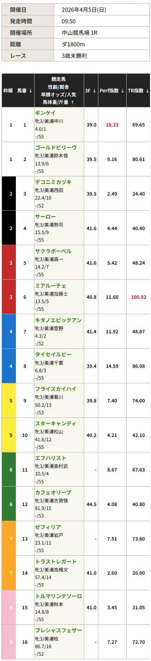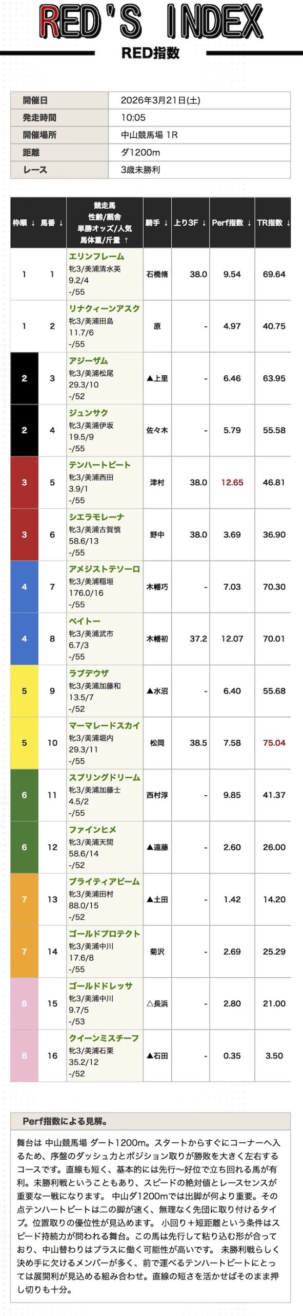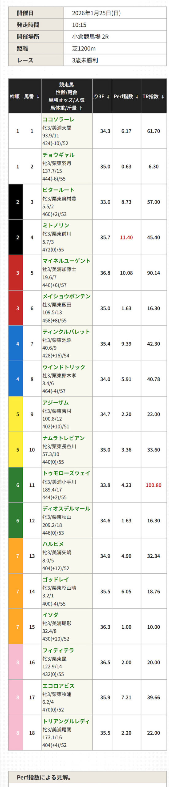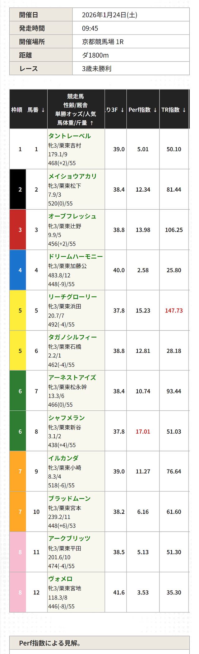 - TR指数:コース適性や枠順など各要素との相性を加味して算出した指数