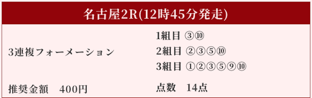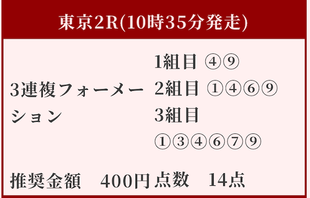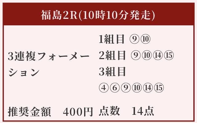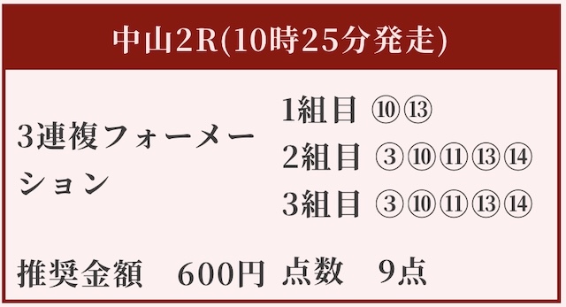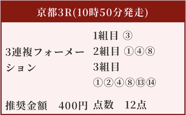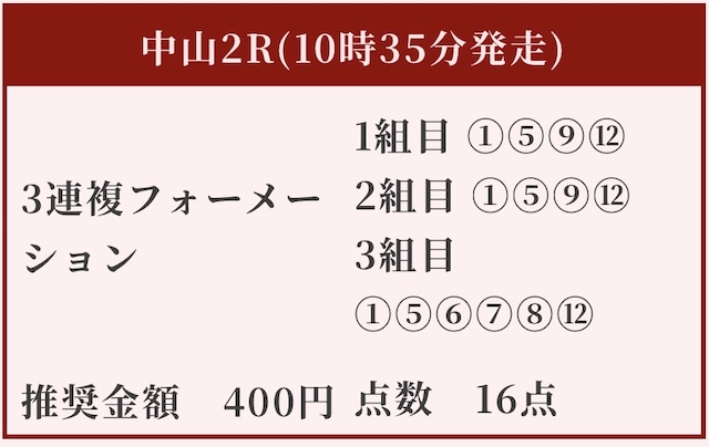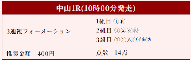最低限でもそれなりの利益は見込まれるか。配当思考本命が大穴馬なので、当たったときのインパクトはかなりのものである事が予想出来ます。