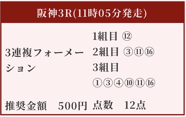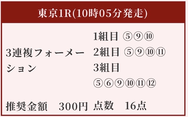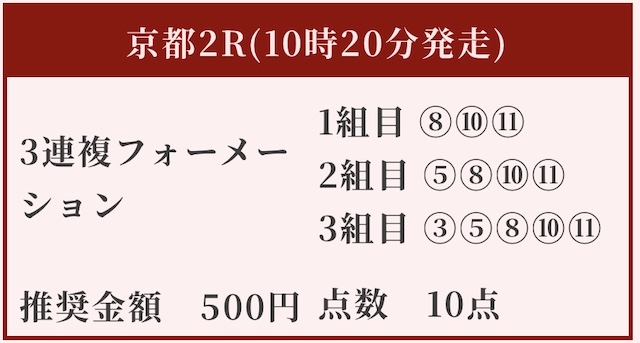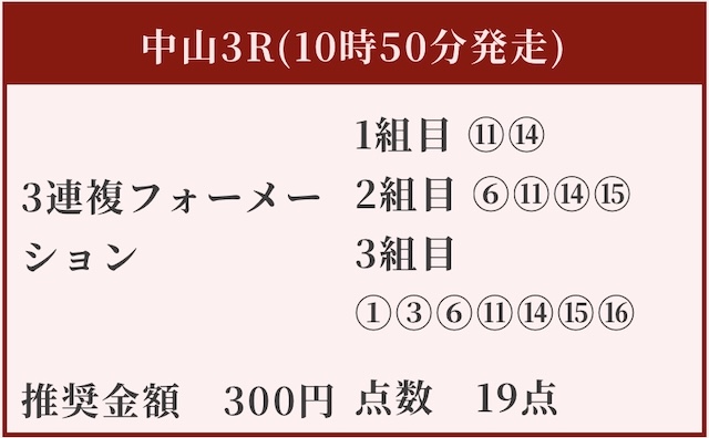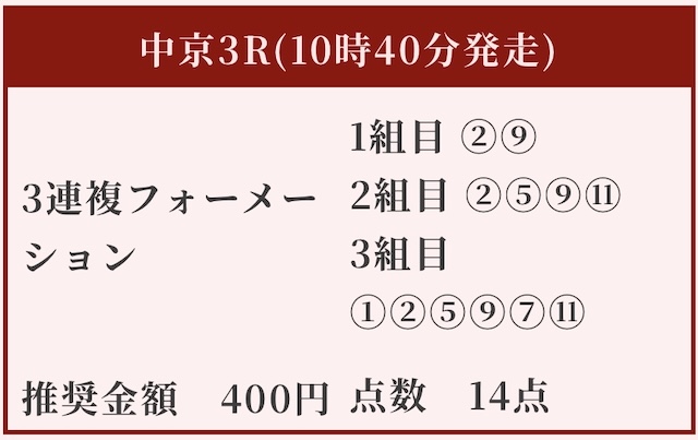- 人気どころを押さえつつダークホース的な馬をピンポイントで選出。比較的利益追求型の買い目に。狙い11番人気以外は順当に人気上位馬を選択。ある程度的中の保証も見えるため案外悪くない買い目かもしれない。