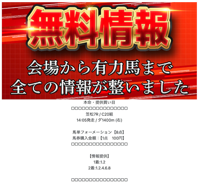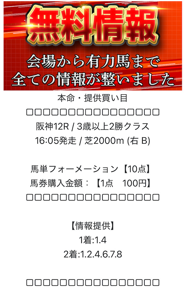 | 無料予想 | 9.9/10点 | 9.9/10点 | 9.9/10点 | 9.9/10点 | 10/10点 |
