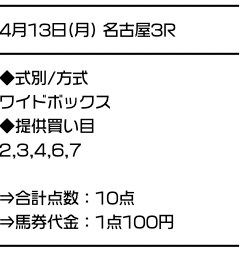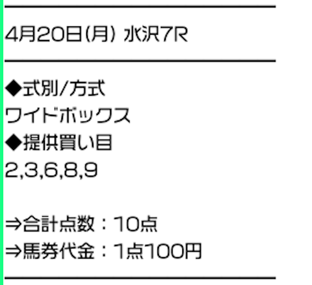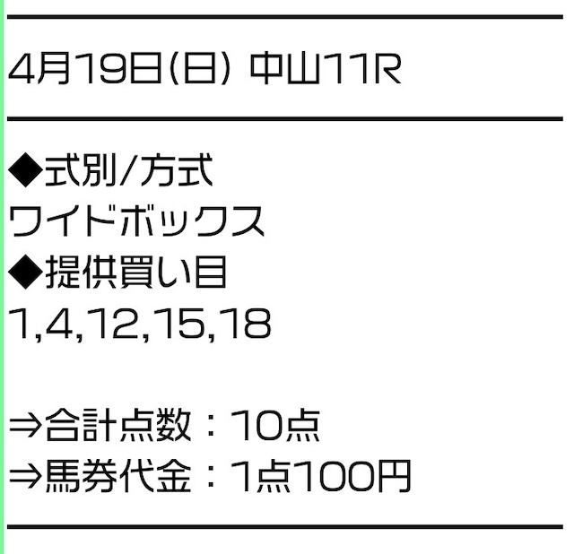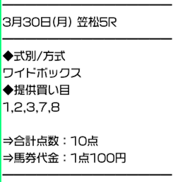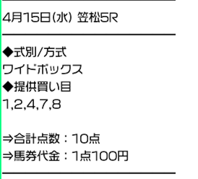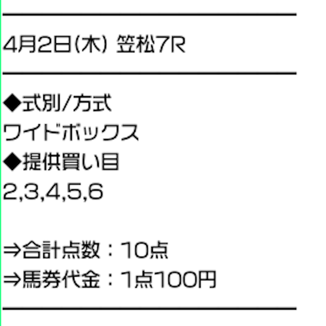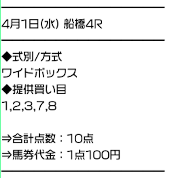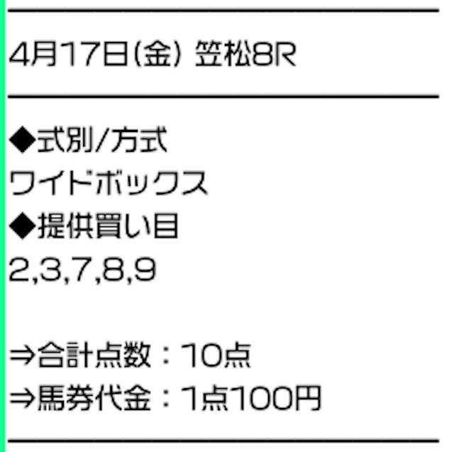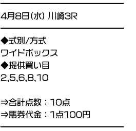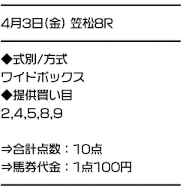 | 日付 | 開催場 | レース | 券種 | 払戻金 | 買い目 |