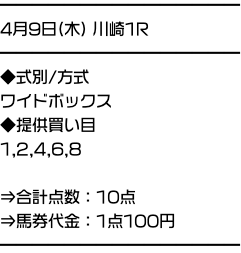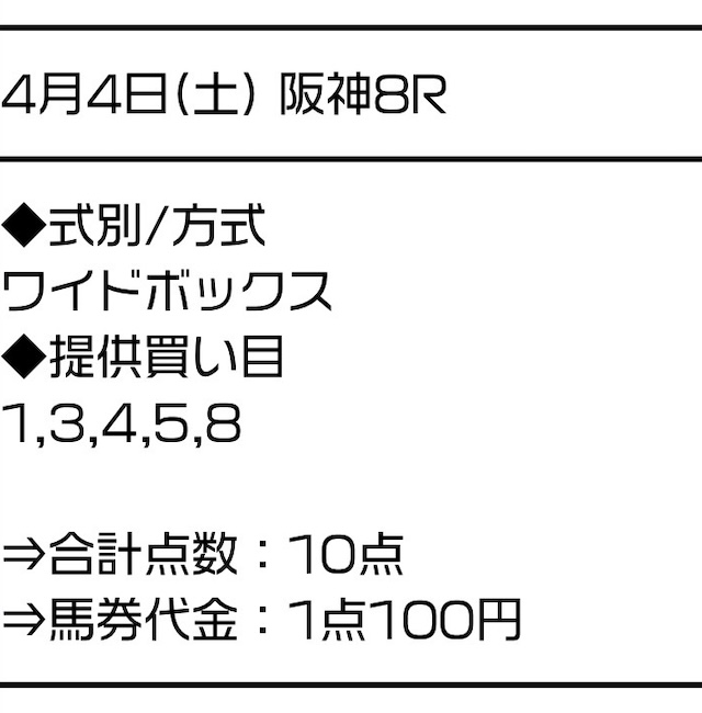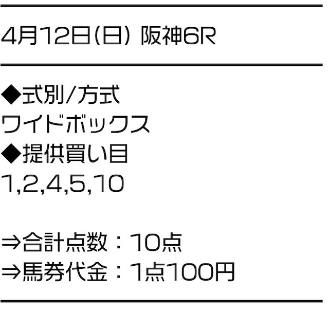 | 26.04.18 | 阪神 | 10R | 馬単 | 30,200円 | |