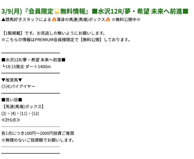 そんな無料予想はどのような券種や投資金額でいつ頃に公開されているのでしょうか。