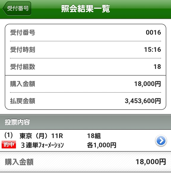 値引きしてくれてたけどしっかりとプラスになって良かった~正直、東京3Rが微妙な当たりだったから期待薄だったけどオクトーバーSで34万馬券1000円掛けで3,453,600円はマジで感動した!次も大きい当たりを狙って、もう一度利用したいと考えてます!なにより不発にならず良かったと思ってる次第です。