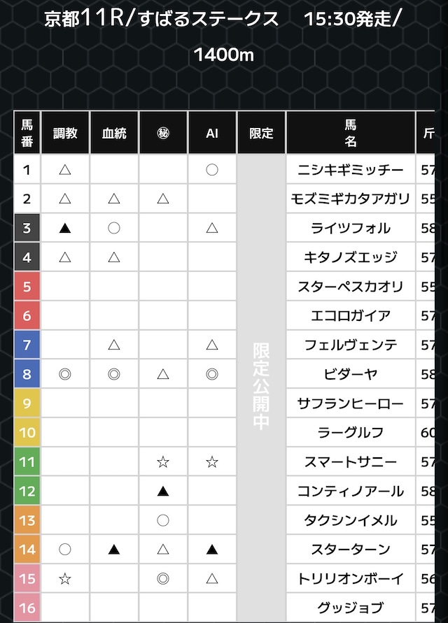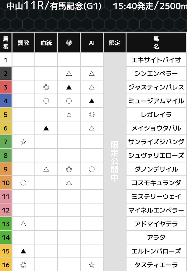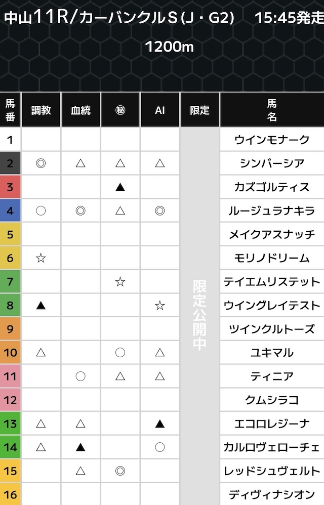 公開される予想においては、中央競馬は出走馬毎にマーク評価での予想公開となっています。