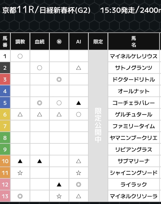 調教評価や血統など複数の要素からマークが記載されているので、複合的に馬を判断することができます。