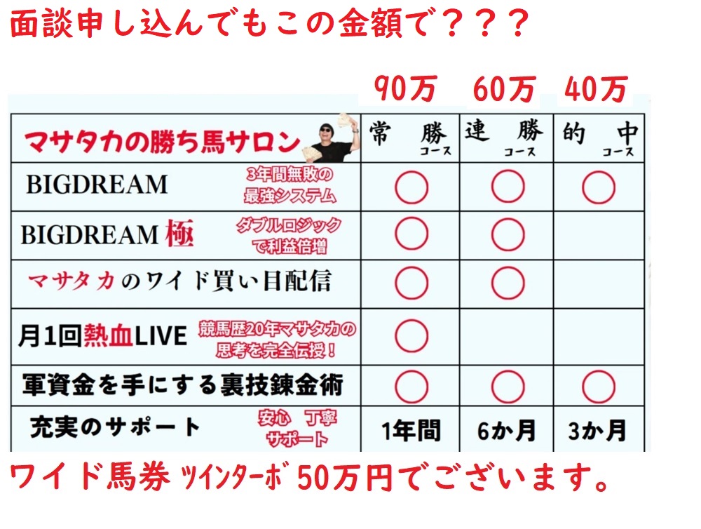 「いまだに本人サングラスにニット帽で顔がわからない、電話面談も本人では無く、誰かもわからない男性に、詳しい説明も無く、40万~200万のコースありますけどどうされますか?って言われたんで、競馬で負けてる一般人が、すぐに出せる金額ではないのに、今は用意出来ないです。って言うと、冷めた対応されたんで、もういいですと言い、電話切りました。だいたい本人が競馬で稼いでるなら、40万以上の高額予想を売る必要無いでしょ。YouTubeの予想動画も、あてにならない。40万以上必要なら面談の前にYouTubeやグループLINEで、教えないとダメですよ。投資競馬を凄く強調してるけど、本人3連系の馬券買って、外しまくってるし、投資馬券で儲けた金で、3連系買うとか、運任せの万馬券狙いって感じで、結局ギャンブルやん~。」
