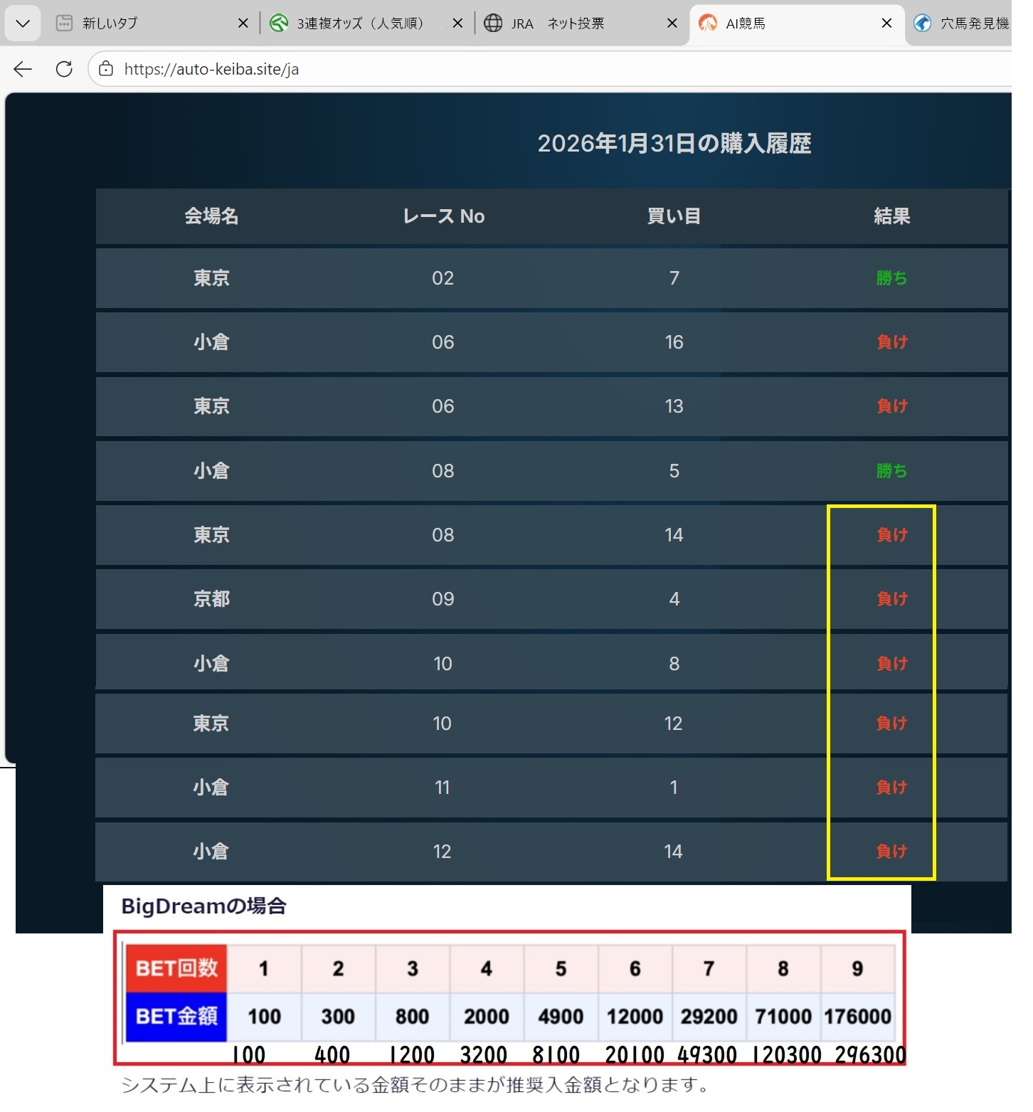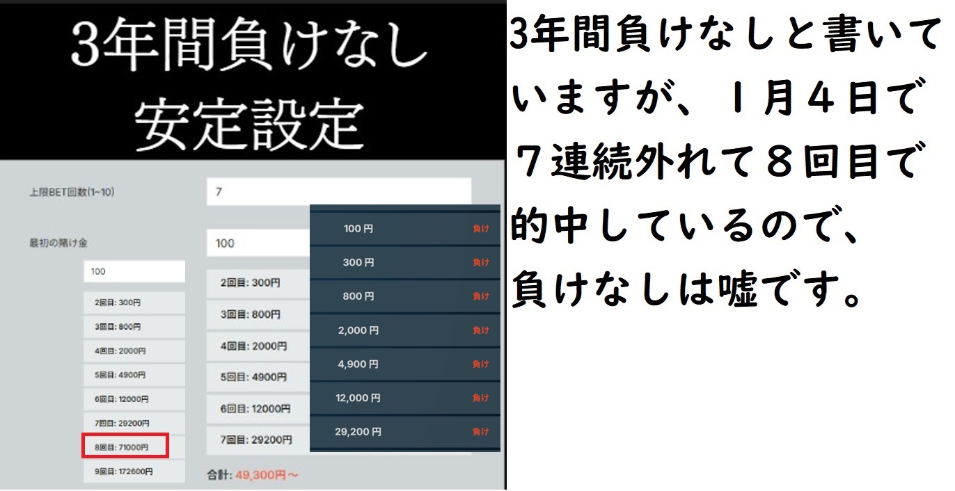 ビッグドリームの設定で3年間負けなしという設定がありますが、1月4日の競馬で7連続で外れているので、この設定の3年間負けなしと言うのは嘘です。そもそも2025年の8月に登録された運営会社に3年間負けなしとという表現は誰が見ても根拠がないのです。