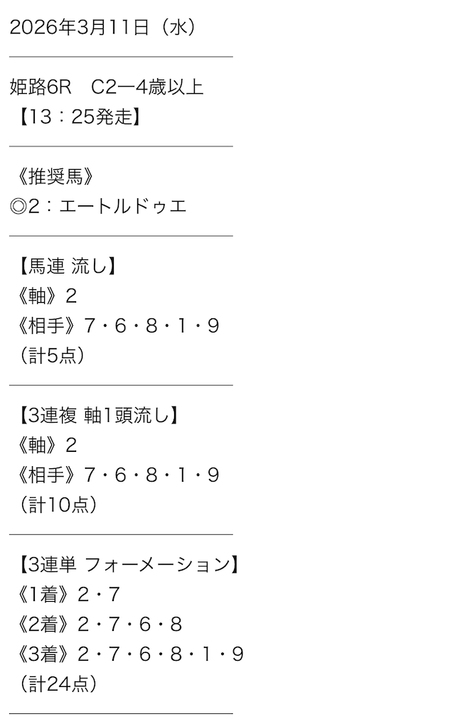 | 2024/02/01 (姫路06R) | 不的中 | 買い目 |
