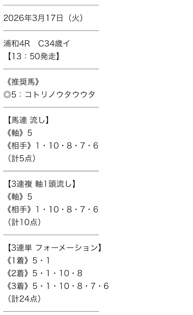 | 2024/02/06 (船橋06R) | 9,500円獲得 | 買い目 |