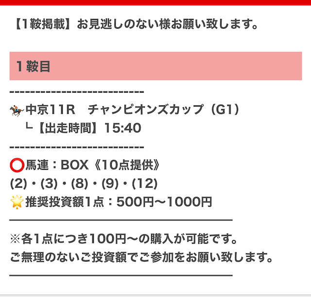 | 券種 | 複勝・単勝・ワイド・馬連・馬単・3連複・3連単のいずれか |