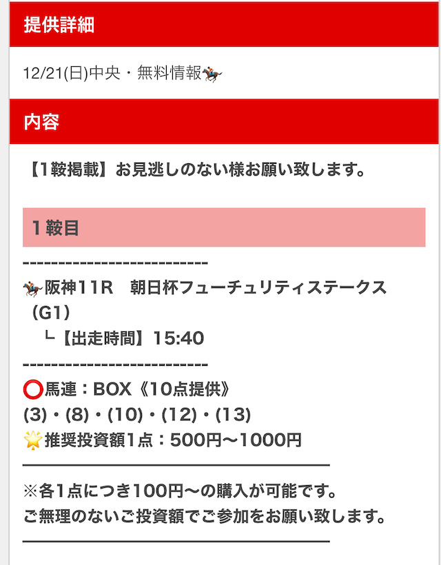 ホームページによると、毎週無料で予想が公開されているそうです。