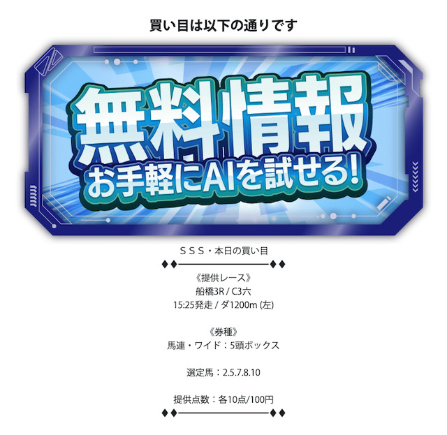 具体的には出走馬から5頭選定し、ボックスを組む形での提供です。