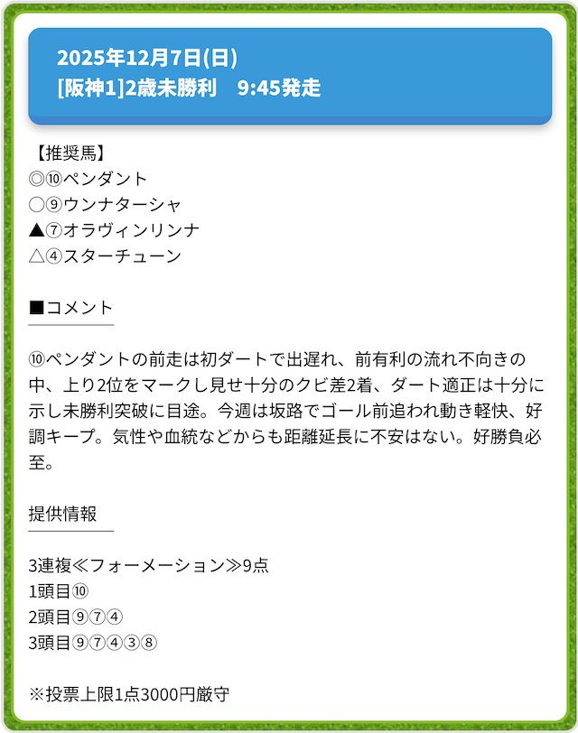 対象は12月9日開催の中山3レースの[サラ系2歳未勝利]。