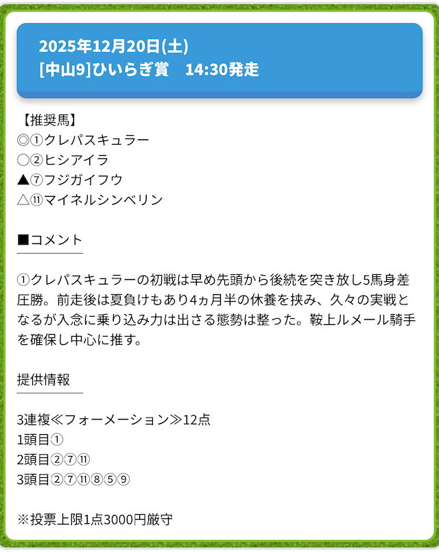 実際に提供された買い目がこちらです。