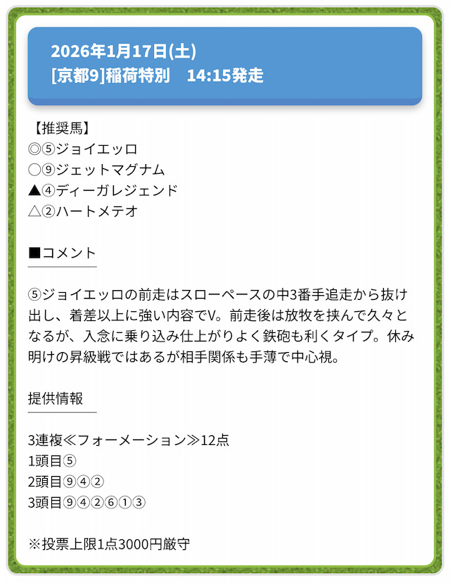 ステップアッププラン安いプランだし3連複だからそこまで期待しなかったけど、思ったより勝てた。しかも2レース提供で2つとも当ててくれたのは有難かった。また参加します。