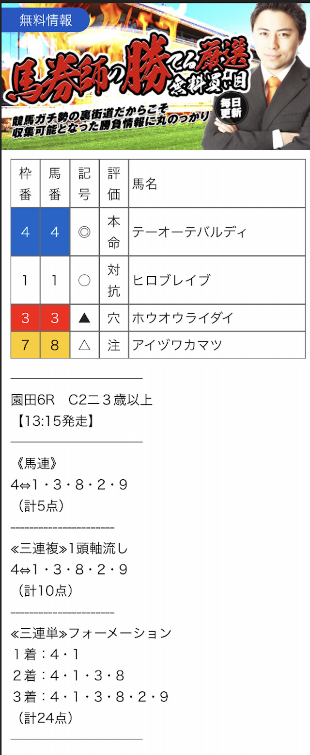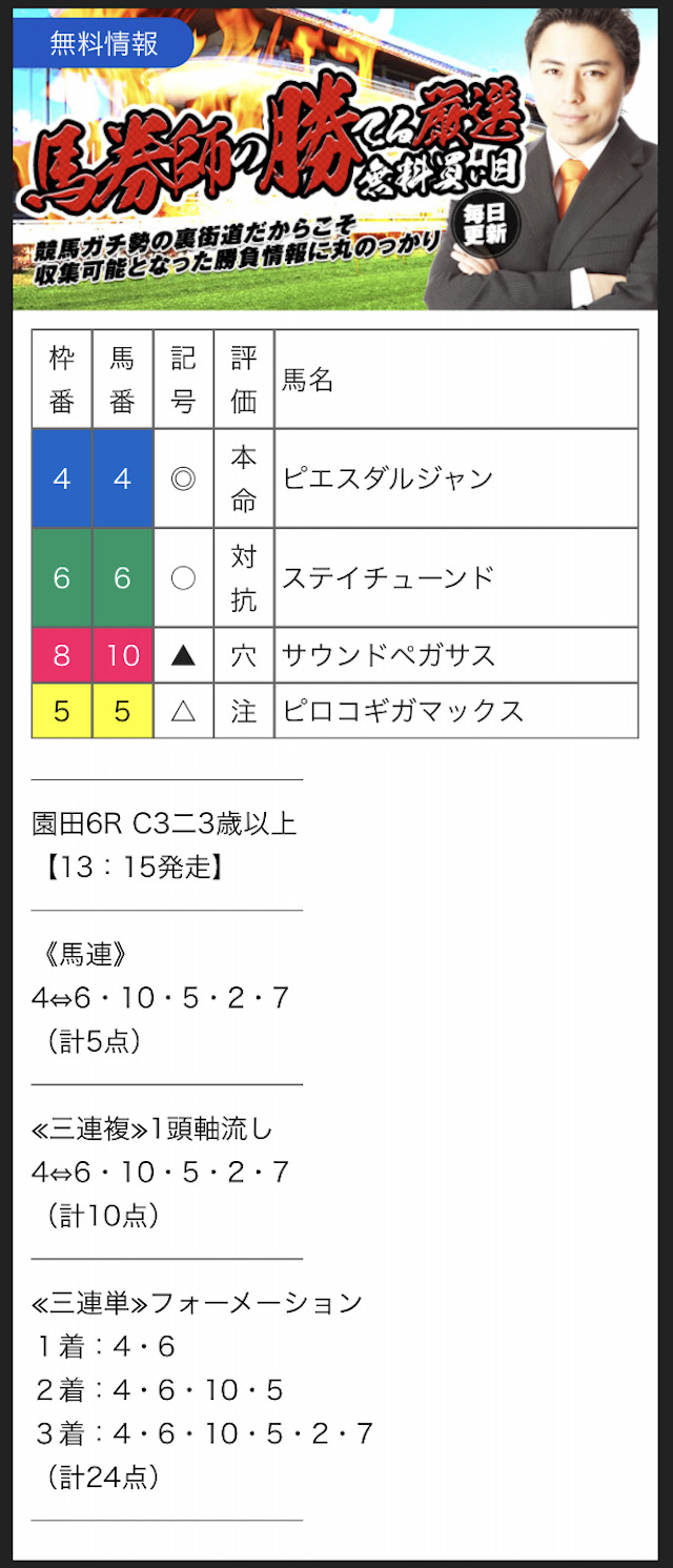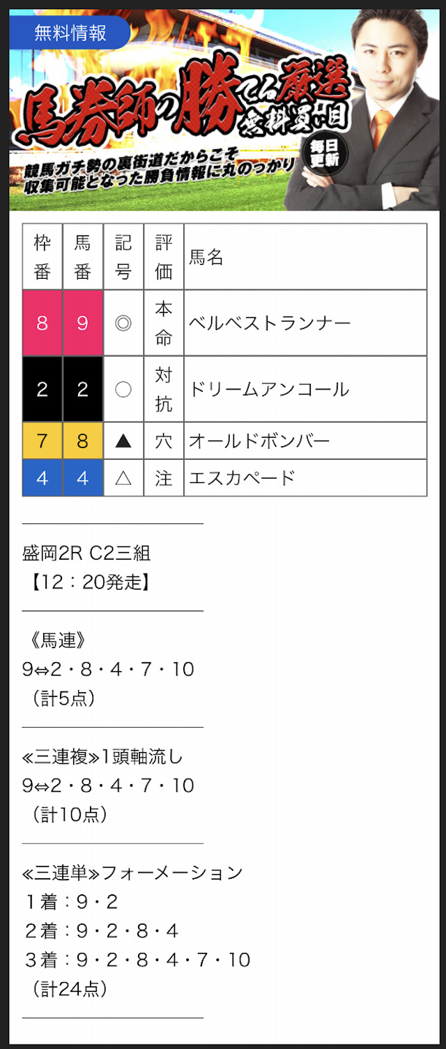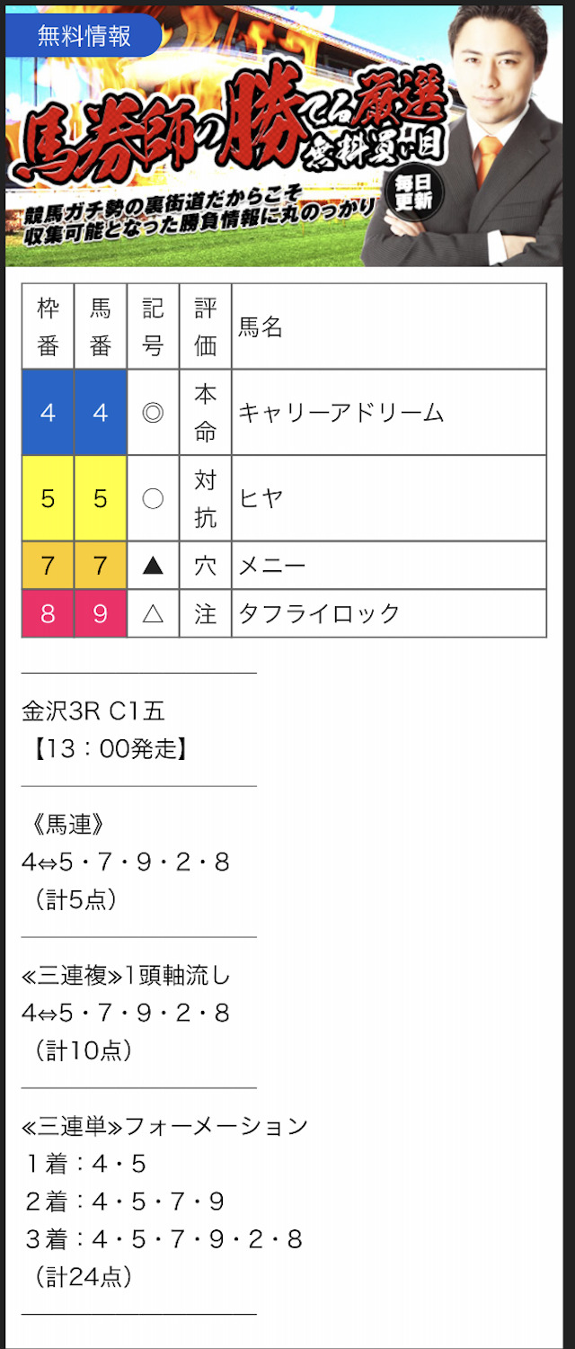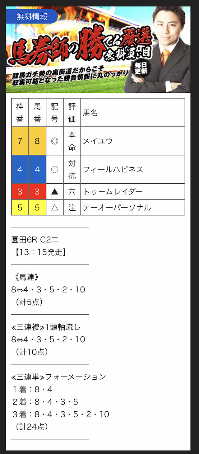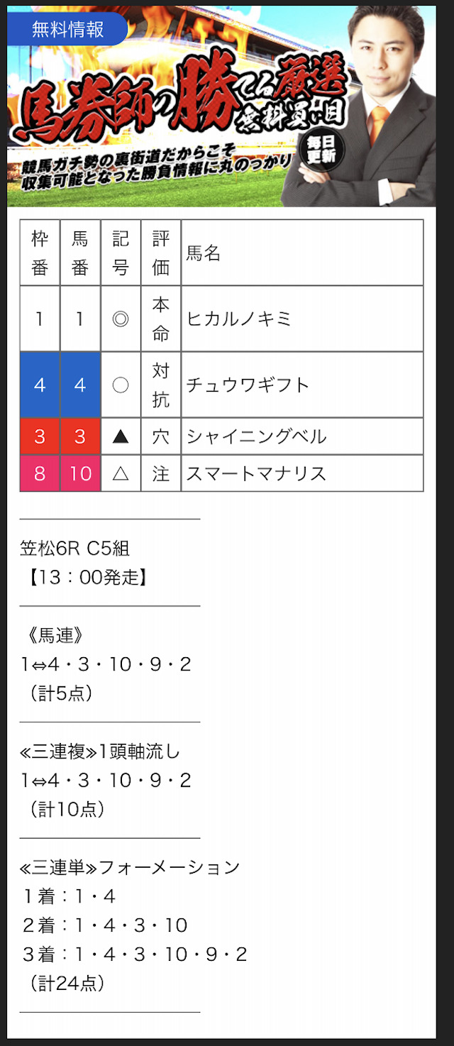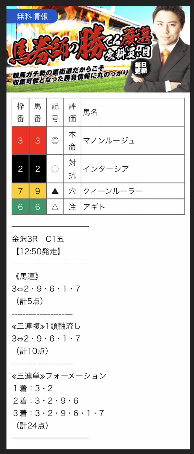 また、無料予想に関しては1レースあたり2~3券種の予想が公開されます。