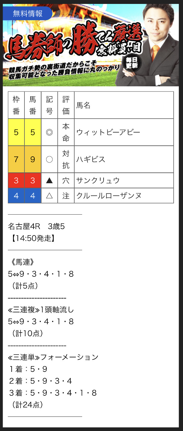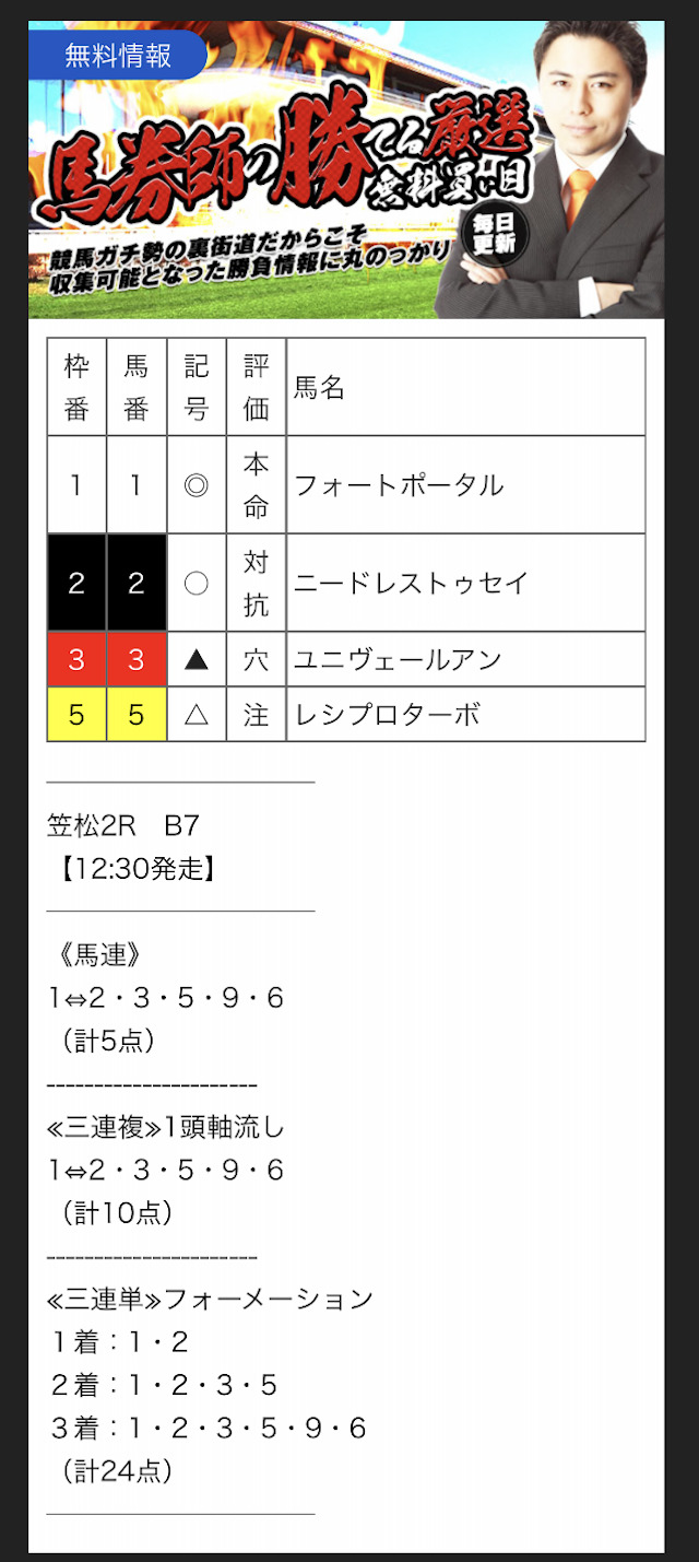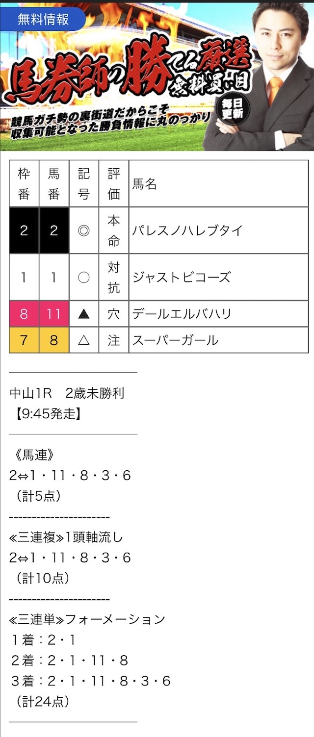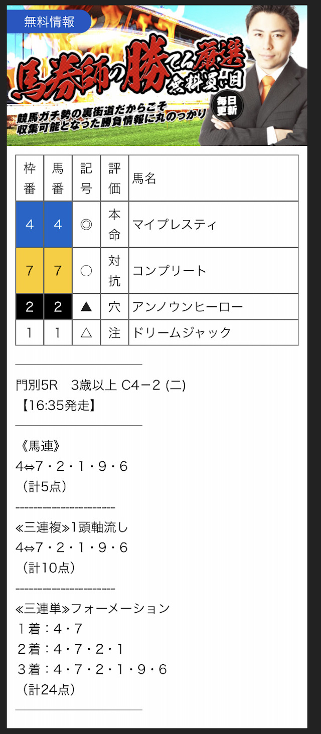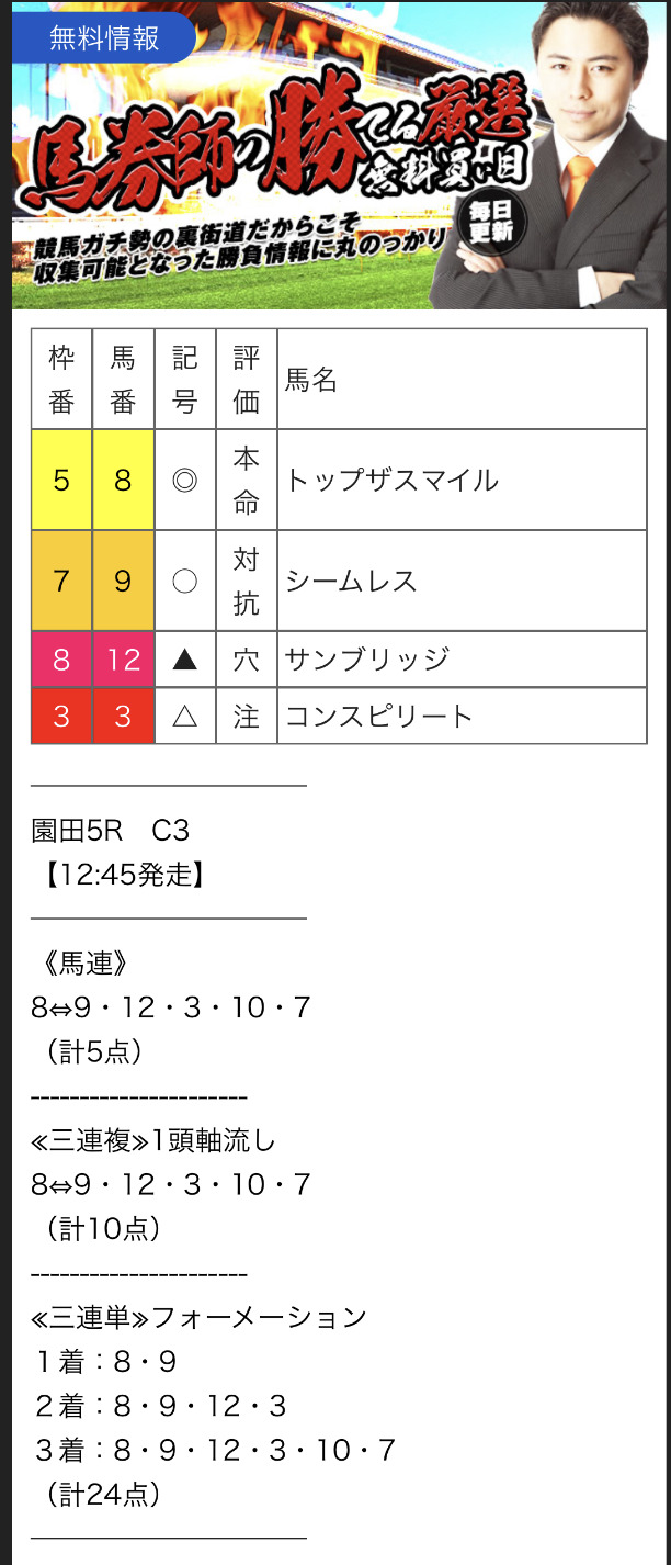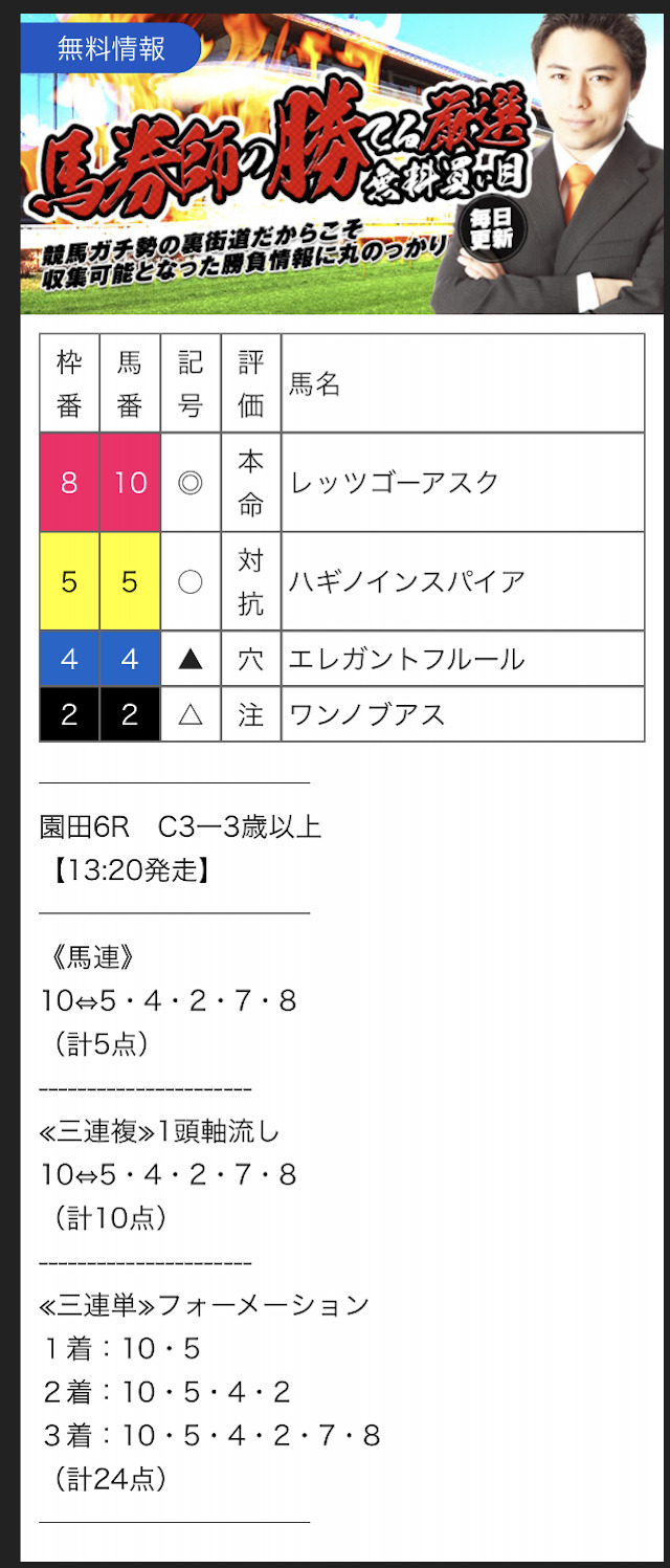 また、無料予想に関しては1レースあたり2~3券種の予想が公開されます。