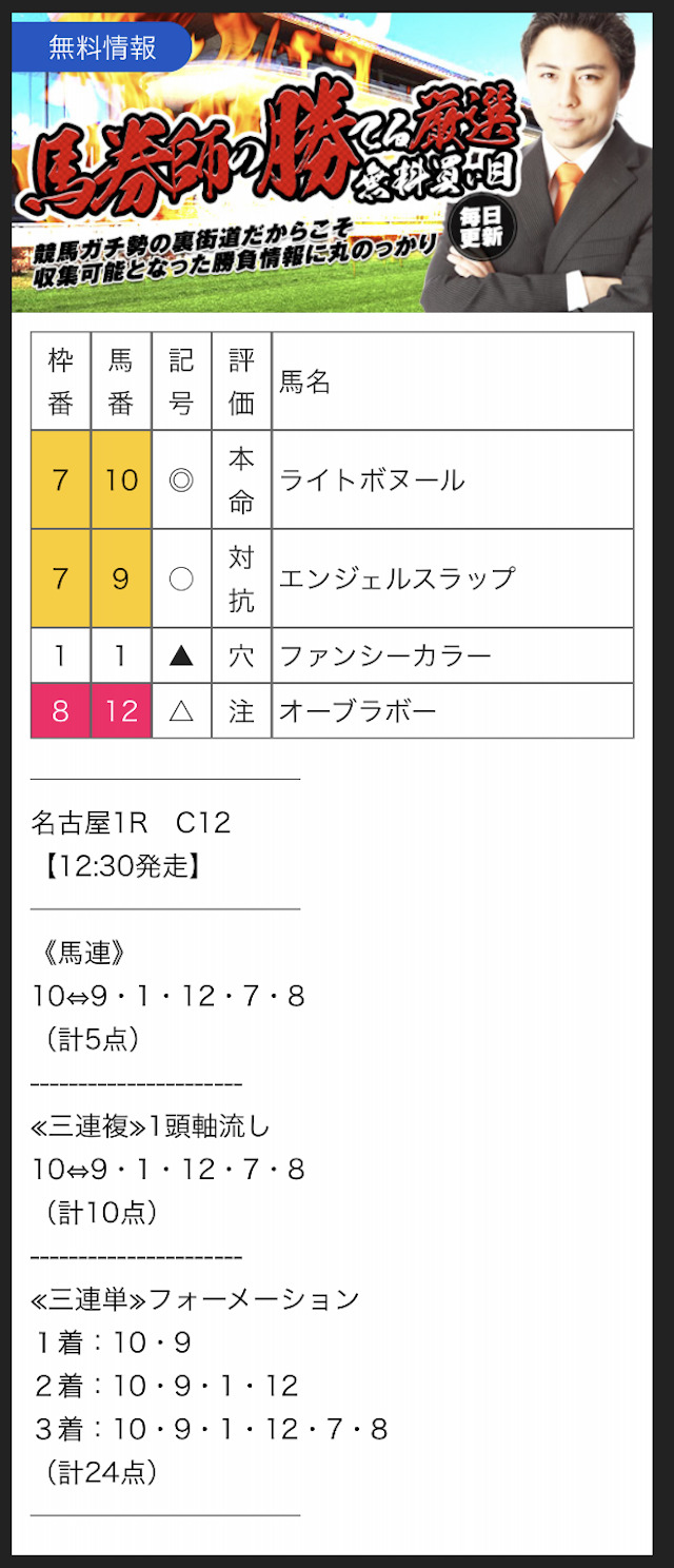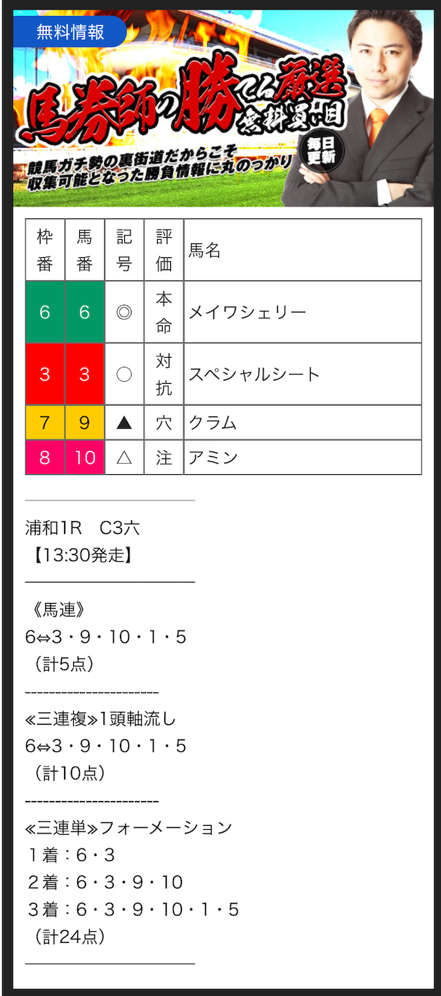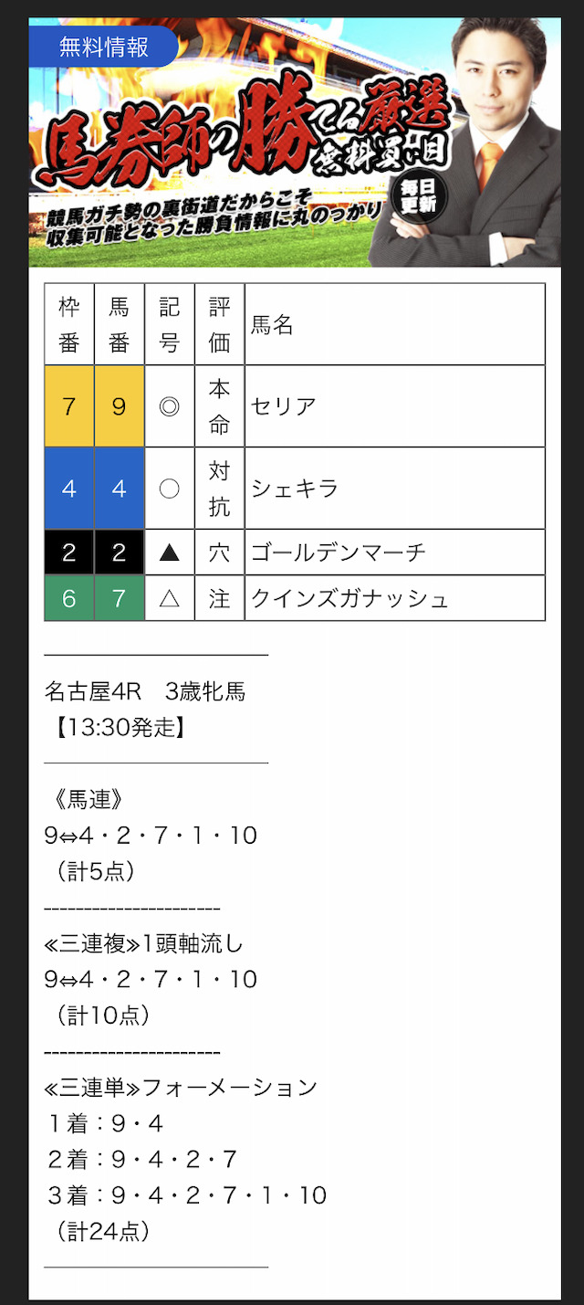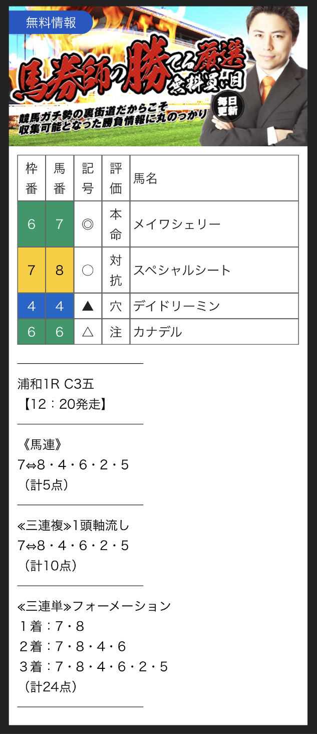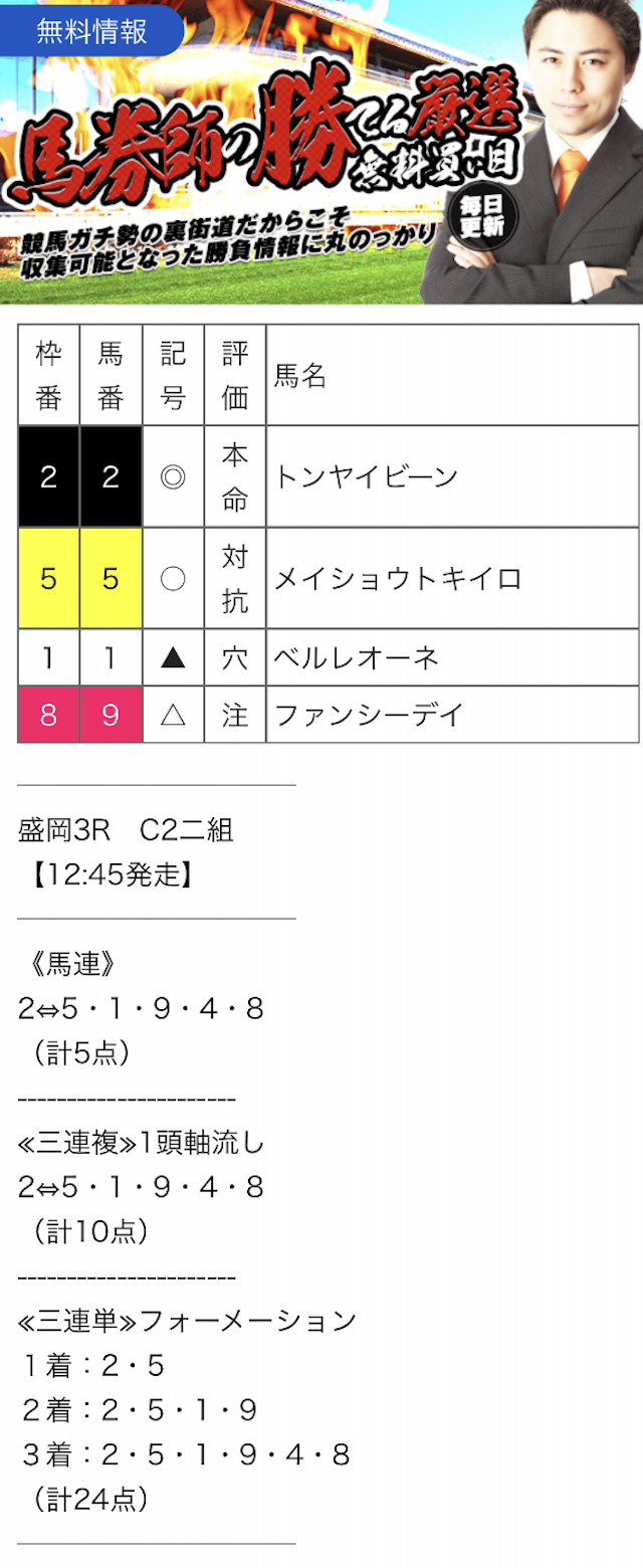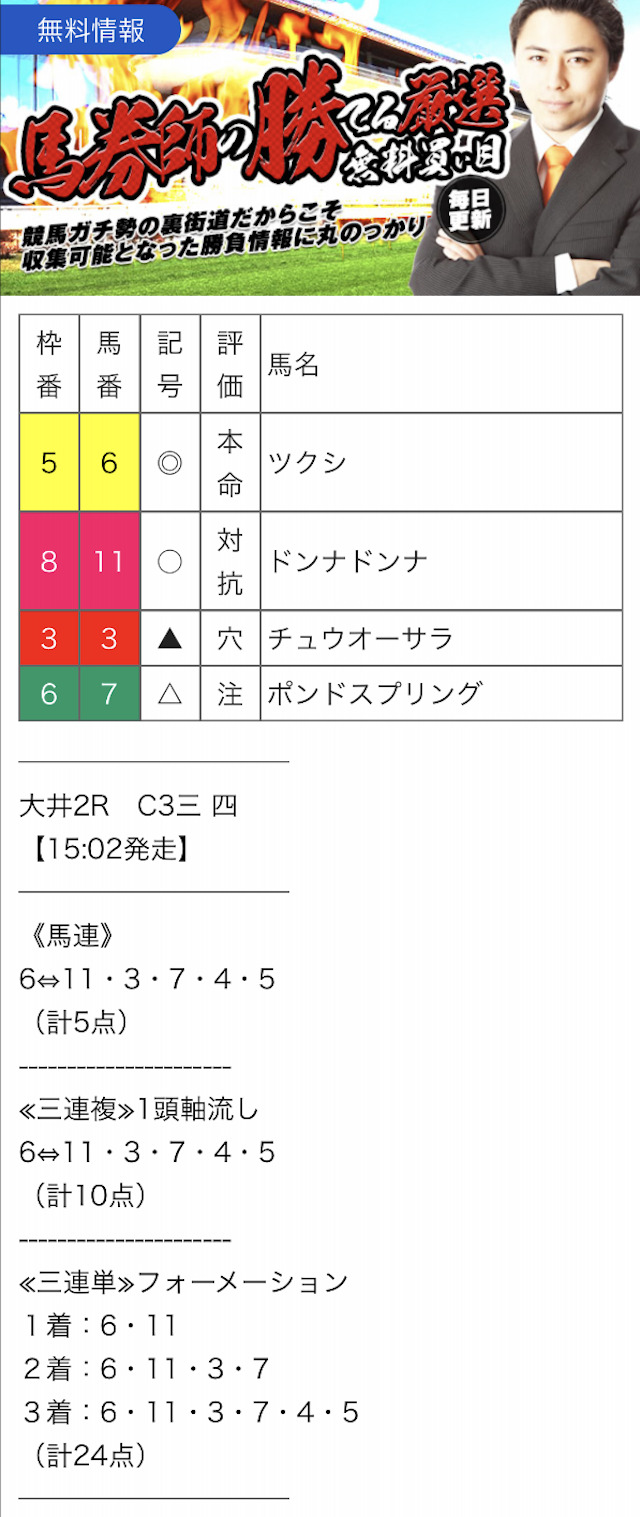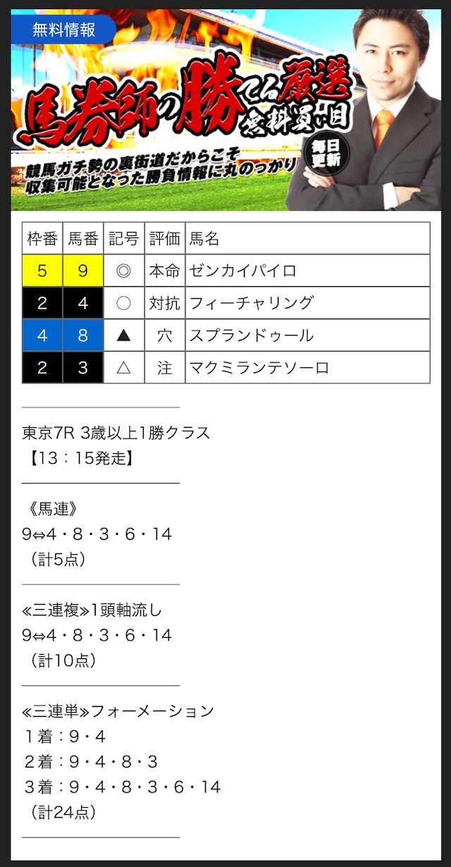また、無料予想に関しては1レースあたり2~3券種の予想が公開されます。