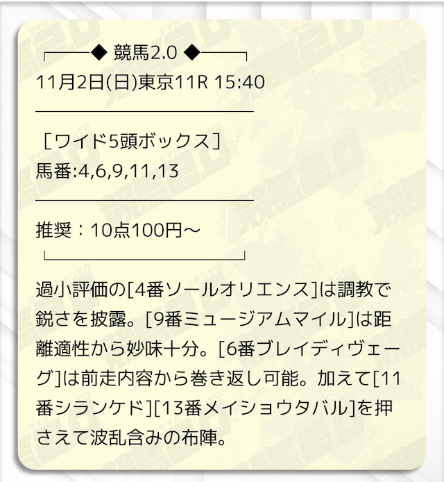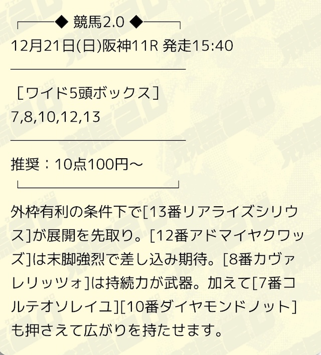 比較的当てやすいと言われている券種ではありますが、競馬2.0は「ほぼ当たる」と言っても過言ではないほどの安定感を誇っています。